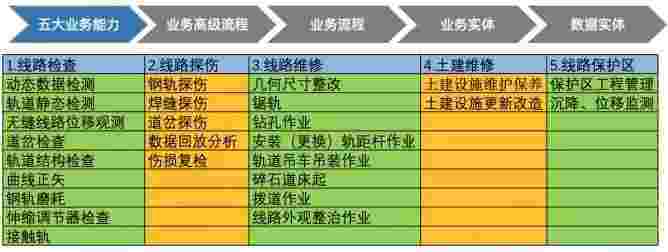 在轨道运维业务中,,,,,,,,我们形成了完整的从业务能力(业务域)-业务流程-业务实体-数据模型的分析梳理过程。。。。轨道运维业务能力如下图所示::::::::