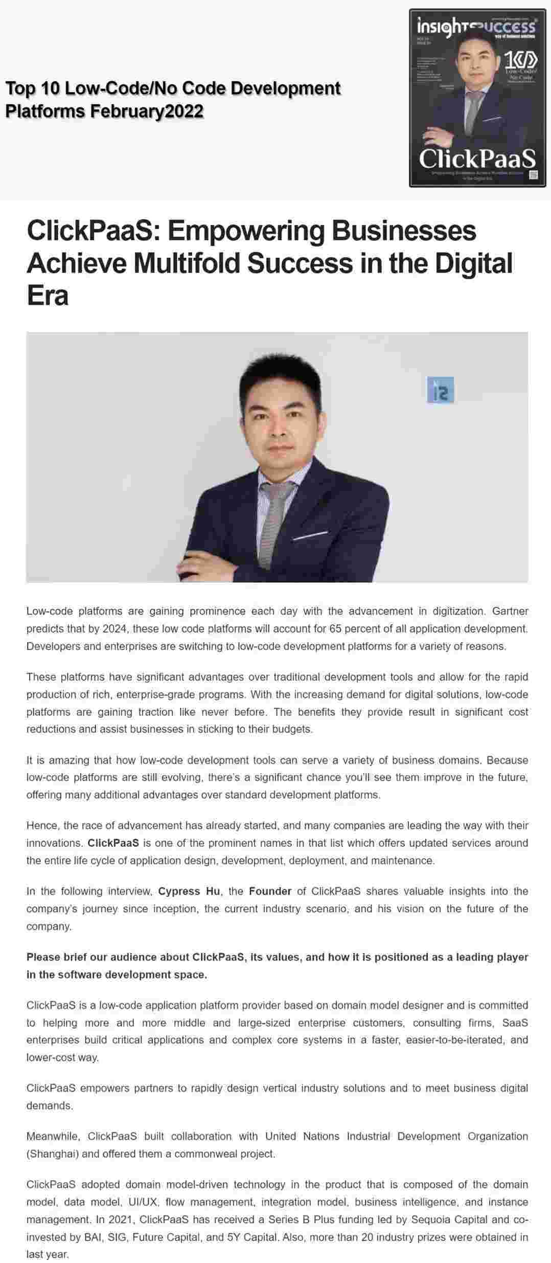 2022年年初,,,,,,,,,,,华为钱包入选外媒Insights Success低代码/无代码开发平台 Top10,,,,,,,,创始人、、、、、CEO胡柏受邀接受专访并荣登封面人物,,,,,,,,他与Insights Success的读者分享了华为钱包成立的初心、、、、、、、、发展历程、、、、、、当前的行业发展趋势以及他对公司未来的展望。。。。。。。。。。
